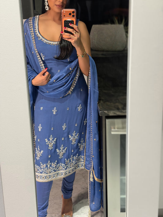 Azure | Blue Linen Pre-Pleated Saree with Pearl Work