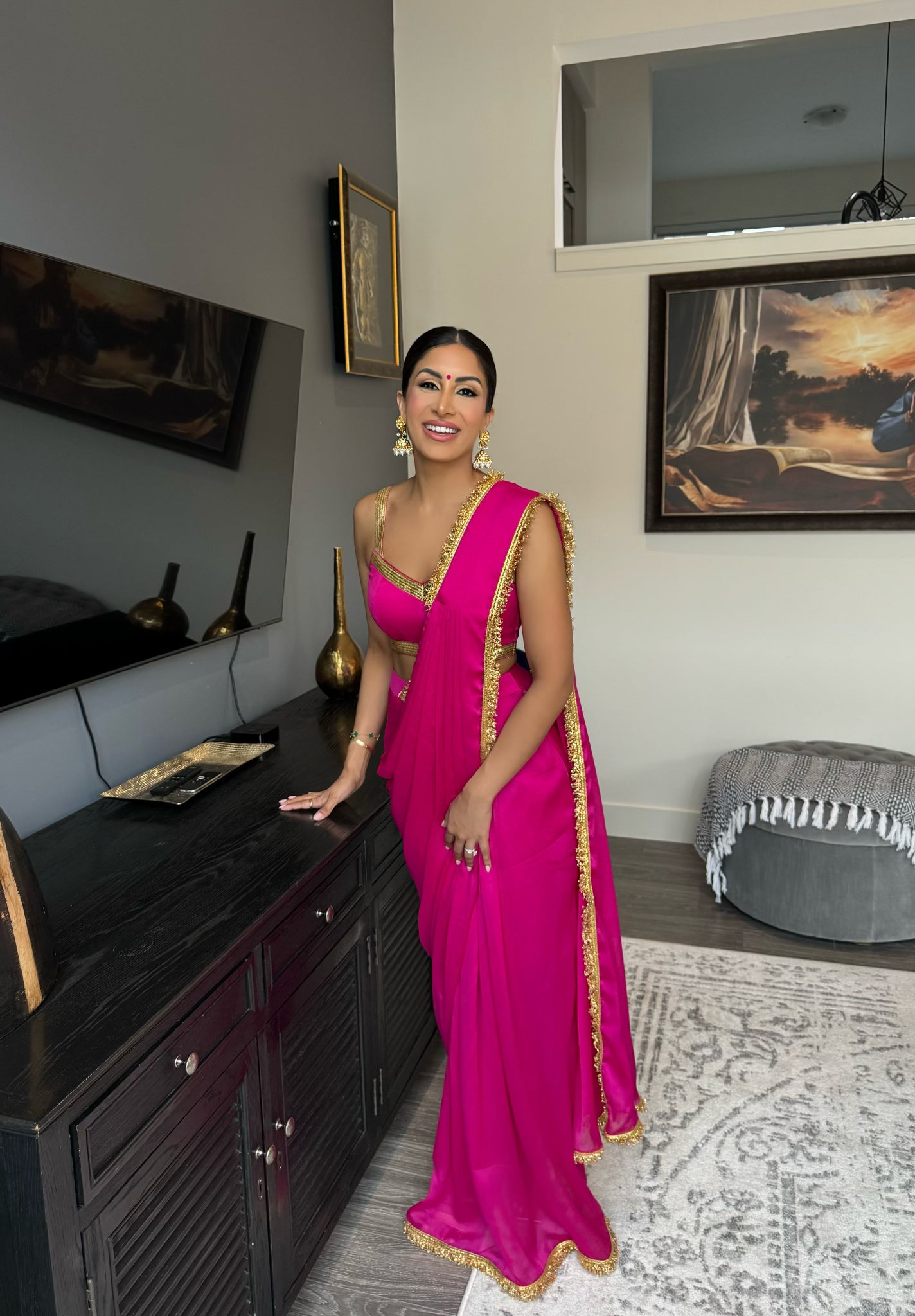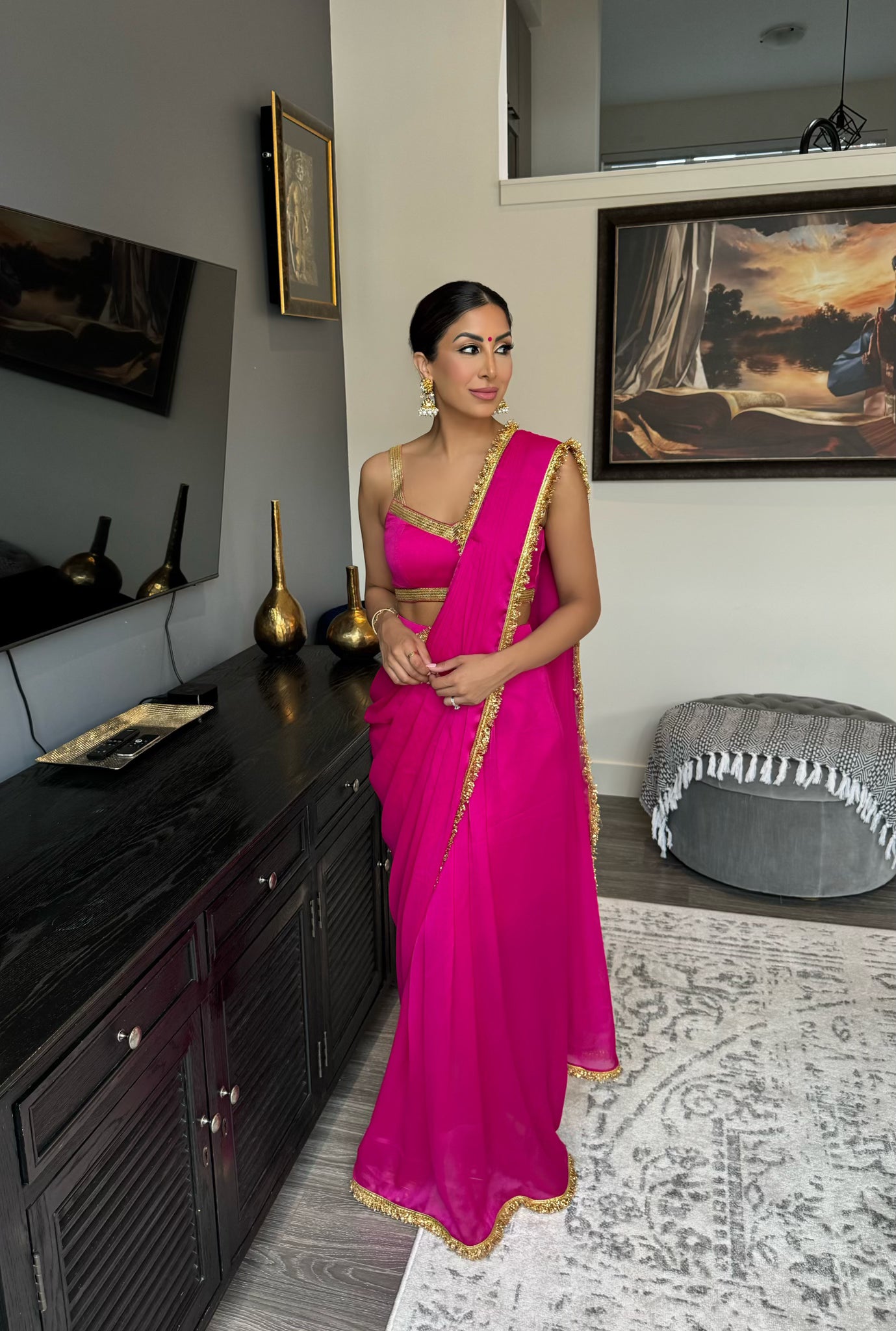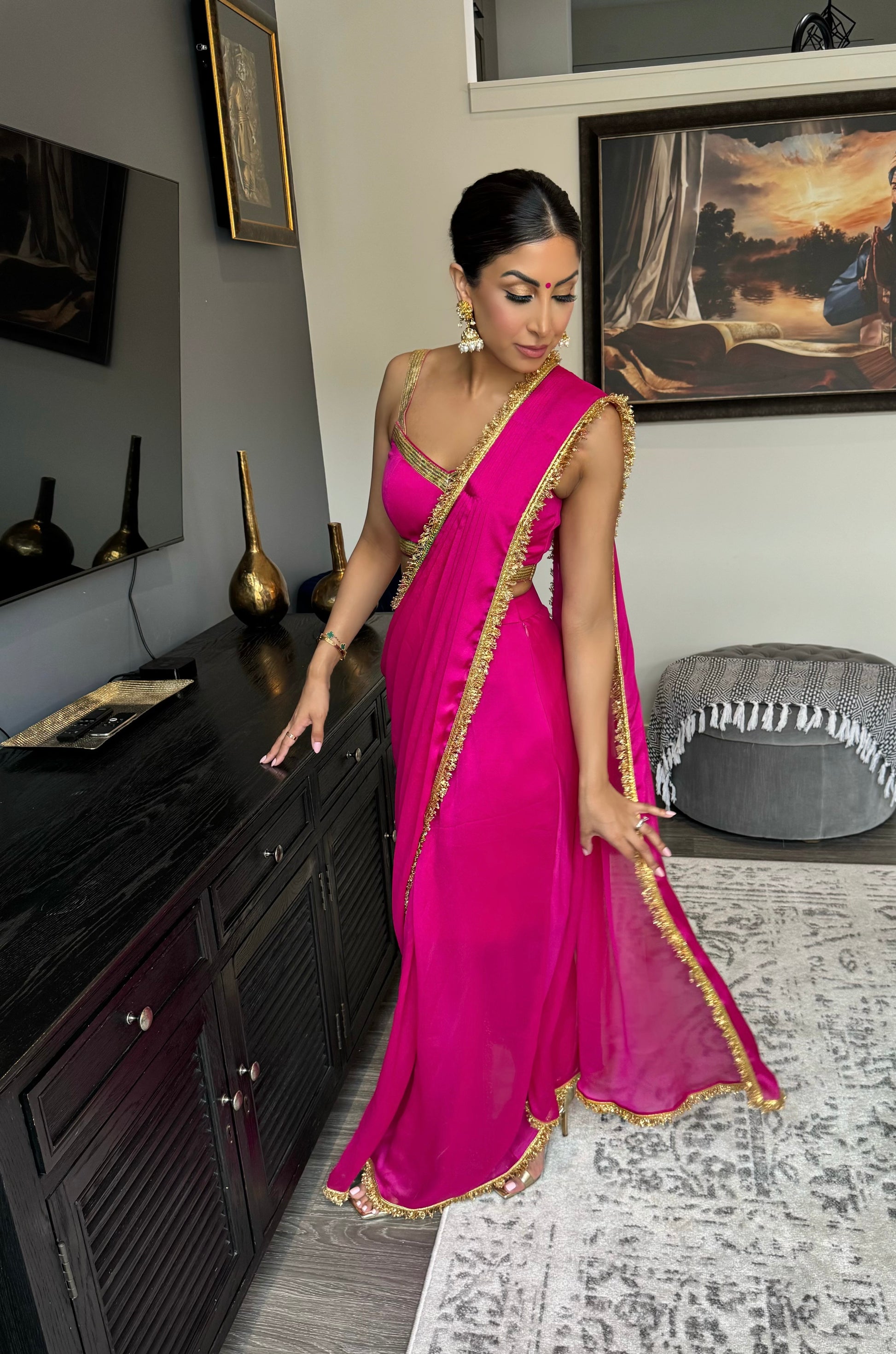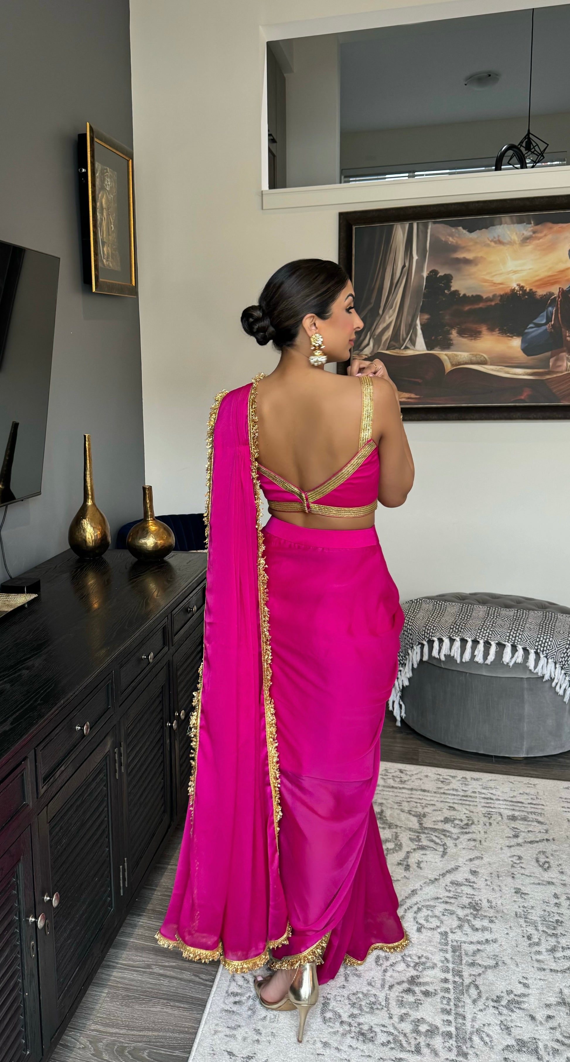 Introducing "Sarina" - a fusion of elegance and modernity. Our ensemble features a pre-pleated dhoti-style saree delicately crafted with a slight slit for added allure. Adorned with intricate frills and classic borders, each piece exudes sophistication and charm. Available in a myriad of colors, "Sarina" offers versatility to suit any occasion or preference. Elevate your wardrobe with this timeless ensemble that seamlessly blends tradition with contemporary flair.